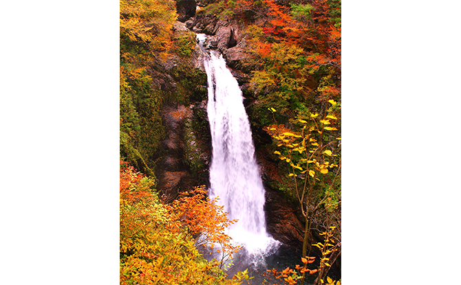 国の名勝で「日本の滝百選」の一つに数えられる名瀑。滝の周囲にモミジやカエデ、ナラなどが生い茂り、10月中旬~11月上旬に紅葉の時期を迎える。滝見台から望む落差55mの全貌が、まさに絵画のような美しさ。