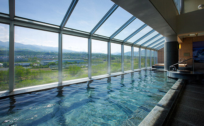 山形市・黒沢温泉にある宿泊施設「悠湯の郷ゆさ」の展望大浴場は、無色透明の自家源泉と、四季折々に表情を変える蔵王連峰を望むパノラマビューが自慢。