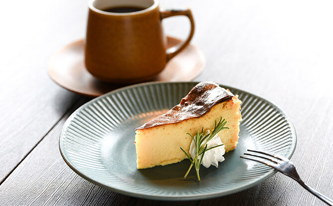 地元・大波産のサツマイモ”紅はるか”を使ったチーズケーキは濃厚。有機栽培のオーガニックコーヒーとともに味わい、安らげるひと時をここで過ごしたい。 -