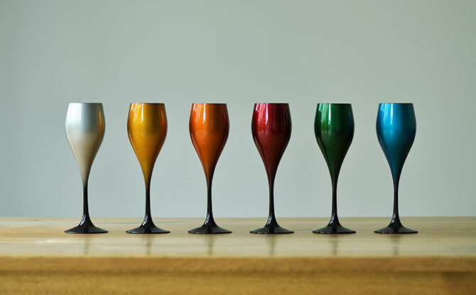 漆芸の伝統的な技法である本堅地下地を施した器に全面銀粉をまき、その上から染料を加えた透明な漆や塗料を塗り上げるのが独特の美しさを生み出す秘密。さらに、産業技術総合研究所東北センターとの共同研究により高耐久性漆器を実現。鑑賞用の器はもちろん、テーブルウェアや文房具など日常に寄り添う製品も数多くラインナップしている。6色の玉虫塗ビクトリーグラス(1脚8800円)は、まさに技術の粋が凝らされた逸品。特別な来客をもてなすのにふさわしい輝きを放っている。 -