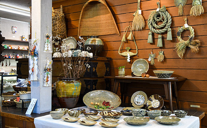 五ッ橋通りを進むと、壁面に蔦が這うどこか懐かしい雰囲気の建物が。窓から覗くと、棚に並ぶ色とりどりの器や手触り良さそうな染め物、可愛らしい郷土玩具などでいっぱい。俄然、興味が高まってお店の扉を開けた。
