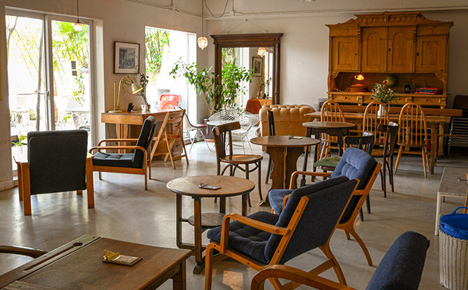 昭和51(1976)年、一番町で開業した「カフェ モーツアルト」。その2号店として、平成17(2005)年8月にオープンしたのがこの「アトリエ」だ。地階へ続く階段を下ると、意外にも大きな窓が張り出した開放的な空間が広がっている。店内には、アンティークの家具や調度類、リトグラフなどが印象的に配され、真空管アンプによるクラシック音楽がゆるやかな時の流れを演出している。テーブルや椅子も趣向さまざま。お気に入りの席を探すのも、ちょっとした楽しみとなりそうだ。