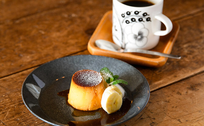 オーダーしたのは、日替わりの本日のケーキ(800円)とブレンドコーヒー(600円、ケーキとセットで100円引き)。この日のケーキは、カフェ モーツァルト6店舗の中で、ここでしか提供していないという特製のカスタードプリン。やさしい舌ざわりと甘さがコーヒーのアロマにマッチし、至福の心地へ誘う。