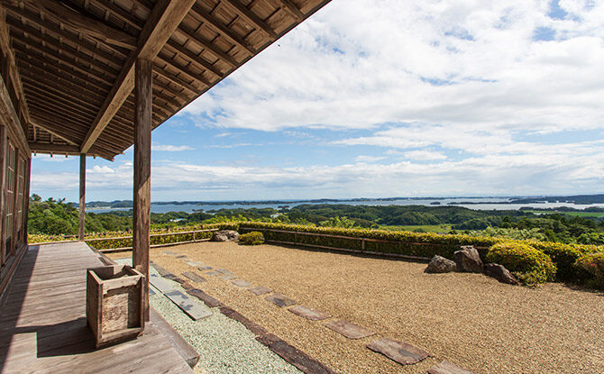 「麗観 富山」の東屋からは、松島を一望できる。松尾芭蕉の弟子・曾良が『曾良旅日記』に記したとされる見事な眺望は、今も変わらぬ美しさをたたえており、時が経つのを忘れて見入ってしまう。