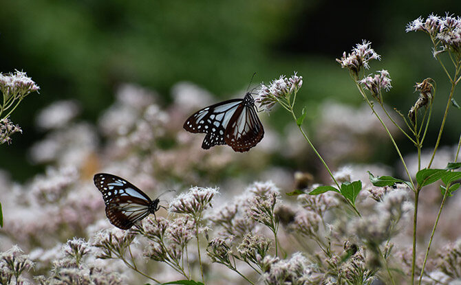 春には、ミズバショウの群生やオオヤマザクラなど、さまざまな花が咲き、秋には広葉樹が色づき、園全体が艶やかな様子に包まれる。9月下旬には、1000km以上の距離を旅する渡りチョウ・アサギマダラが、フジバカマの群生に飛来する姿も。