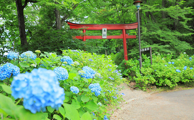 見頃は6月下旬から7月上旬。雨の日に訪れれば、しっとりと濡れそぼったアジサイが、遊歩道沿いに柔らかなグラデーションを描き出し、静かで趣ある景色を生み出す。