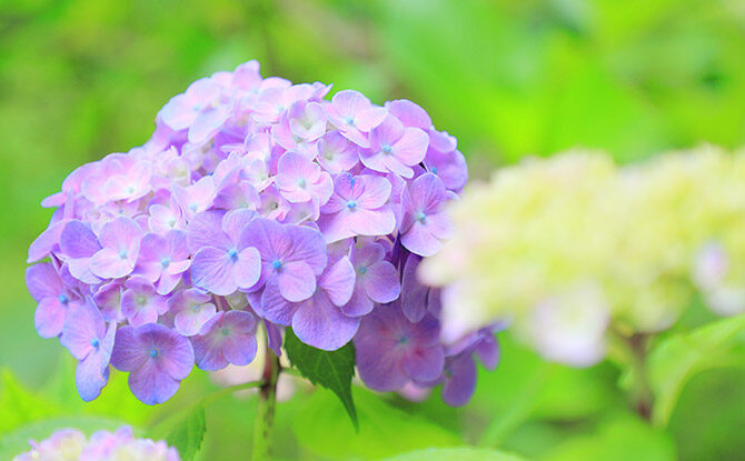 ガクアジサイやヤマアジサイ、西洋アジサイなど、さまざまな品種を楽しめる