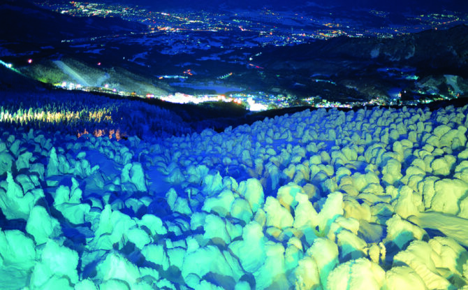 平均気温マイナス10度からマイナス15度という厳しい環境の中で、アオモリトドマツが雪と氷に覆われることで、その幻想的な姿が現れる。高さは5〜10mにもおよび、その迫力は、まさに“雪と氷の芸術”と呼ぶにふさわしい。
