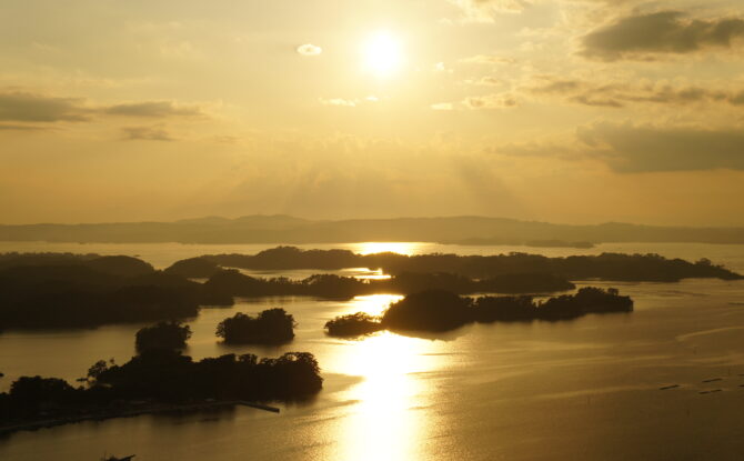 松島湾にゆっくりと沈む夕日は、息を呑むほどの美しさだ。 -