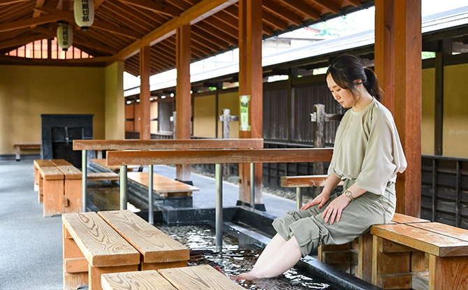 飯坂地区に点在する源泉から引いてきた温泉で満たされた「足湯・手湯」は、観光客に人気。お湯の出口付近は50度くらいでやや熱めだが、足湯が楽しめる浴槽では40度になっておりちょうどいい湯加減になっている。散策の合間にほっと一息つくのに最適なスポットだ。