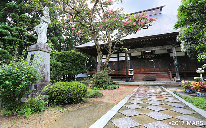 826(天長3)年、弘法大師の手による薬師如来像を祀り、古くから鯖野薬師の名で親しまれてきた名刹。奥州藤原氏の一門であり信夫地方を治めていた佐藤一族の菩提寺で、奥州三十三観音特別霊場にもなっている。本堂は1806(文化3)年に再建されたもので、源義経の家臣として信頼の厚かった兄・継信は屋島の戦いで、弟・忠信は京都吉野で戦死し、この寺院で弔われている。兄弟を失った母・乙和は大いに悲しみ、それを慰めようと兄弟の武将姿になって激励した継信の妻・若桜と忠信の妻・楓の人形が本堂内部に収められている。