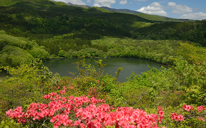 オールシーズン、素晴らしい景観で訪れる人々の目を楽しませてくれるが、5月上〜下旬頃、女沼を見下ろす位置から見える「つつじ山公園」に咲くヤマツツジの花畑は実に見事。雄大な吾妻連峰を背景に、周囲の緑と鮮やかな朱赤色が美しいコントラストを描き、散策者たちを感動に誘ってくれる。