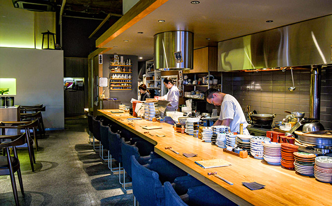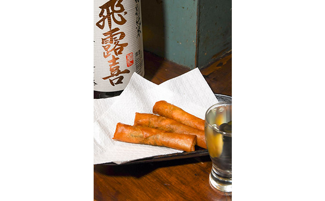 常磐沖で水揚げされる高品質な魚介ブランド“常磐(じょうばん)もの”のメヒカリを使った揚げ春巻き(550円)も絶品だ。脂がのった繊細な味わいの白身が、ほくほくとした口当たりで実にうまい。もちろん、看板酒の「飛露喜」ともベストマッチする。なお、この店では日本酒の瓶を受け取り、お客が自分の手元で注ぐのがルール。表面張力ギリギリを攻めて、一滴もこぼすことなく注ぎ切りたい。また、日本酒3種飲み比べ(1320円)もお得なのでおすすめだ。