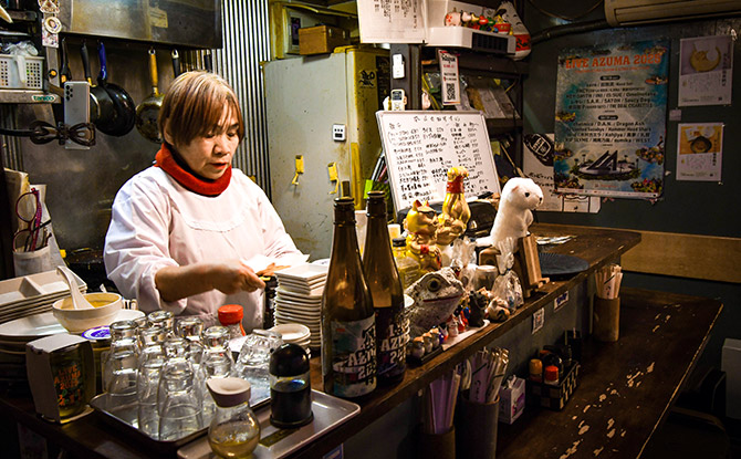 出迎えてくれたのは、この店を一人で切り盛りする店主の岩橋香代子さん。会津で生まれ育ち、店名にもこよなく地元愛が込められている。東日本大震災の被災地支援で会津若松市内の県立高校に炊き出しボランティアで訪れた際、会津坂下町の廣木酒造本店が手掛ける「飛露喜」「泉川」が、原発事故の風評被害で返品が相次いでいるという話を聞き、「私がお酒を売る!」と発奮したのが、このお店を始める原動力になったという。そんな情に厚く、きっぷの良い接客が心地よく、遠方からこの店目当てに訪ねてくる客も少なくないそうだ。