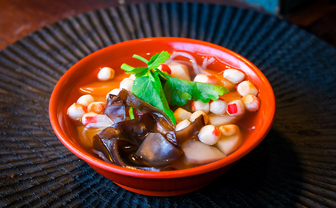 カウンター奥に置かれたホワイトボードには、福島県内の名物や郷土料理の名前がずらりと並んでいる。会津地方の家庭で、年末年始やお盆、冠婚葬祭などに欠かせない「こづゆ」(660円)は、特に人気の高い一品。ホタテの貝柱から取った上品な出汁をベースに醤油と酒で味を整え、小口に切った里芋やニンジン、キクラゲ、豆麩などの具材がたっぷりと入る。縁起を担いで、具材は奇数にするのが習わし。地域や家庭によって具材の切り方や味付けも変わる。朱色が美しい会津塗のお椀は、岩橋さんの母親から受け継がれた大事な品だそう。汁を一口含むと、ほっと心安らぐ瞬間が訪れる。