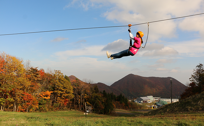 木の間に張られたワイヤロープにプーリー(滑車)をかけて一気に滑り降りる、スプリングバレー仙台泉スキー場で人気のアクティビティー。7コースのマウンテンツアーが用意されており、ターザンになった気分で挑戦したい。